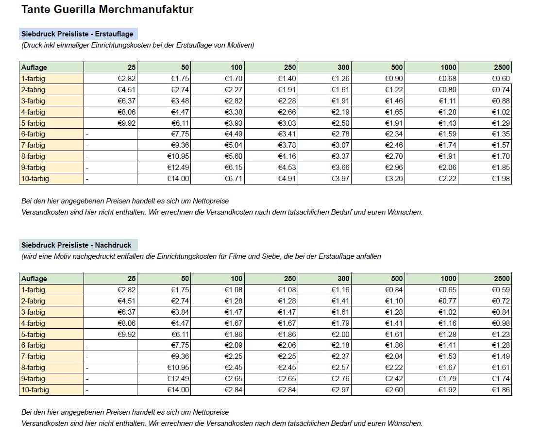 Bei den Preisen für Siebdruck, Transferdruck, Digitaldruck und Stick sind die Preise für die zu bedruckenden Textilien nicht enthalten. Wir bieten eine große Anzahl an Textilien an, die veredelt werden können. Für die Textilien gelten besondere Preise und Konditionen in Verbindung mit einem Textildruck-Auftrag. Die Textilpreise im Tante Guerilla Webshop gelten für Endkunden beim Kauf eines unbedruckten Basic-Textils. Für einen Textildruck-Auftrag gelten andere, günstigere Preise. Auch hier gilt: Wir suchen für euer Wunschtextil den besten Preis bei unterschiedlichen Anbietern.